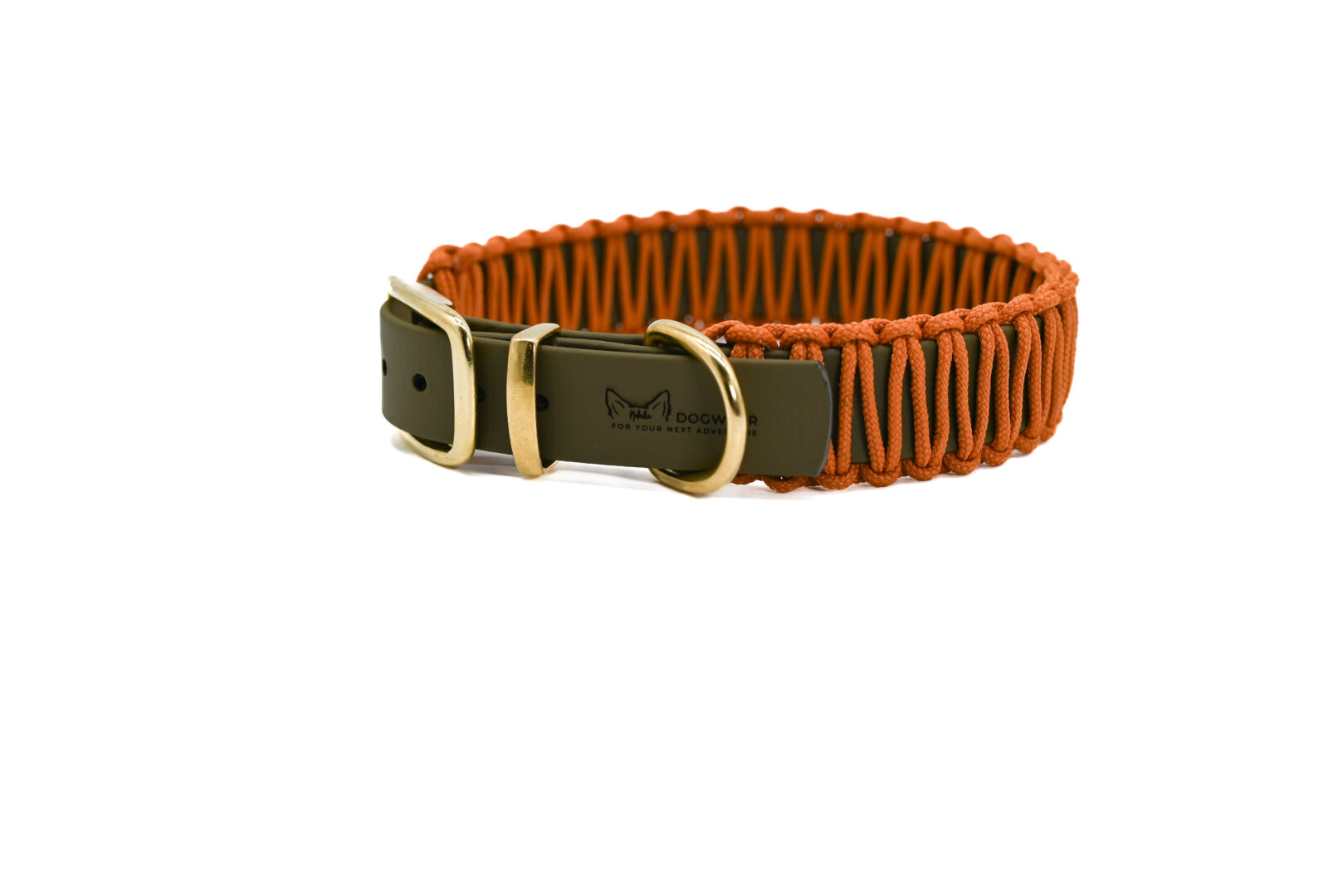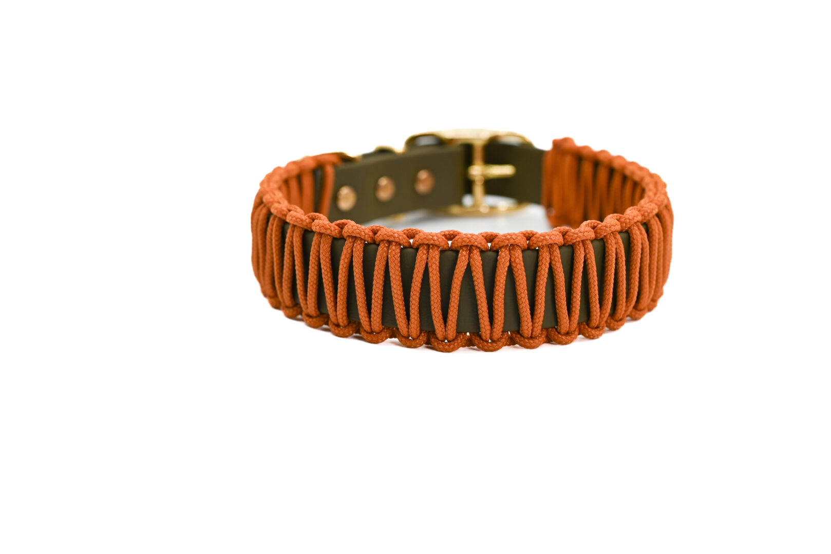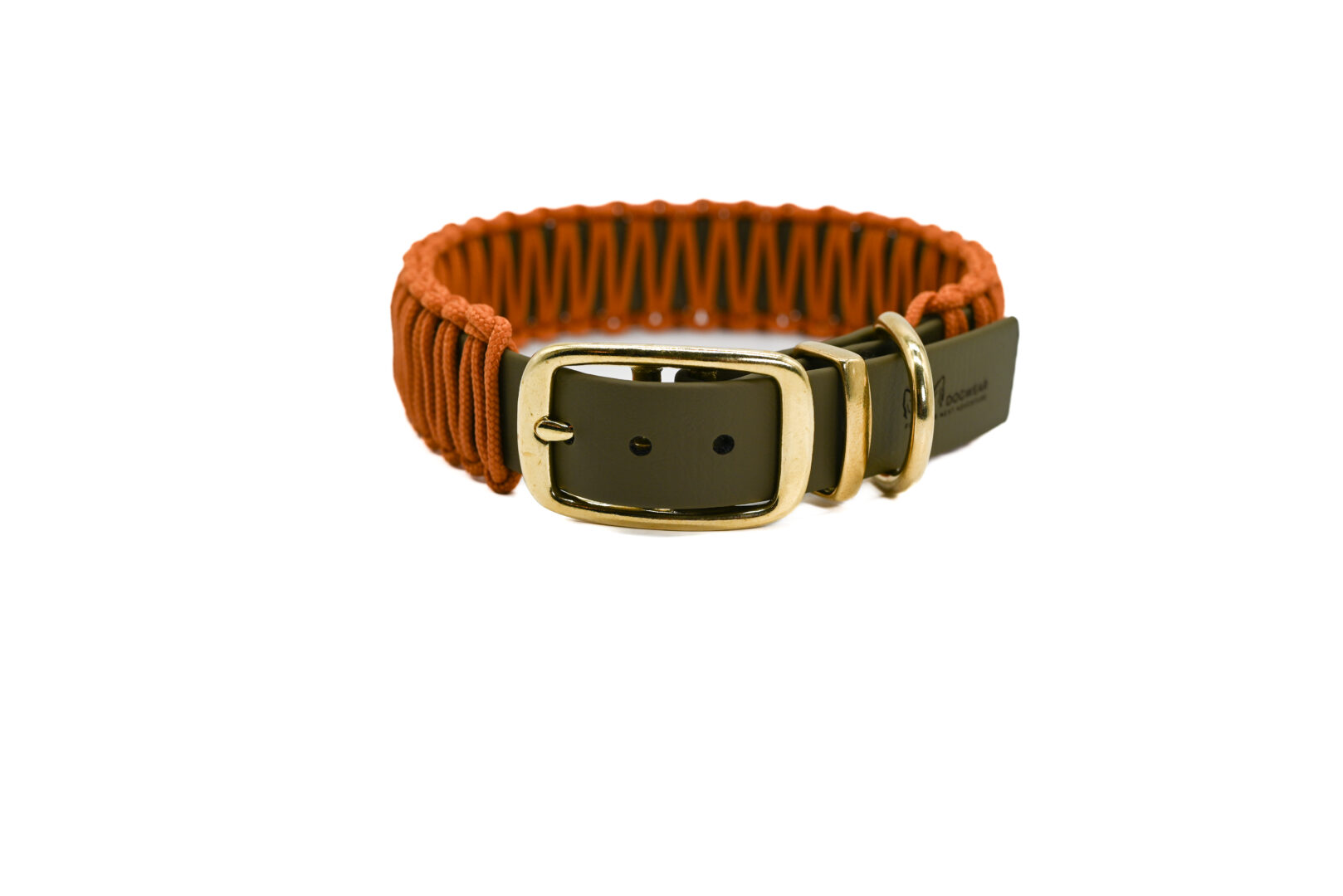 Khaki BioThane®-Material – Stilvoll umwebt mit Paracord Typ II in Orange und Beschlägen deiner Wahl für einen eleganten Look. Praktischer Ring für die einfache Befestigung von Leine und Hundemarken.