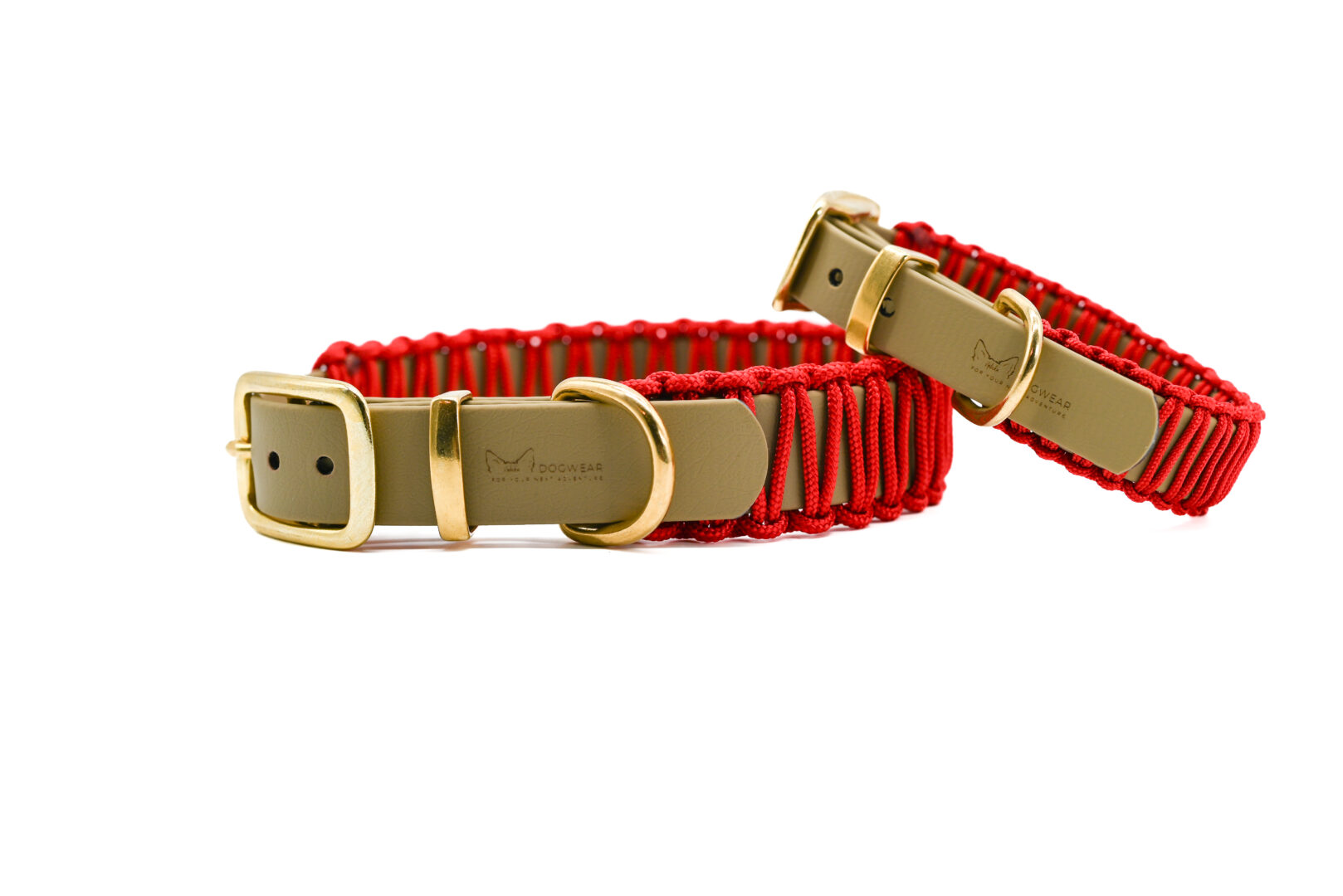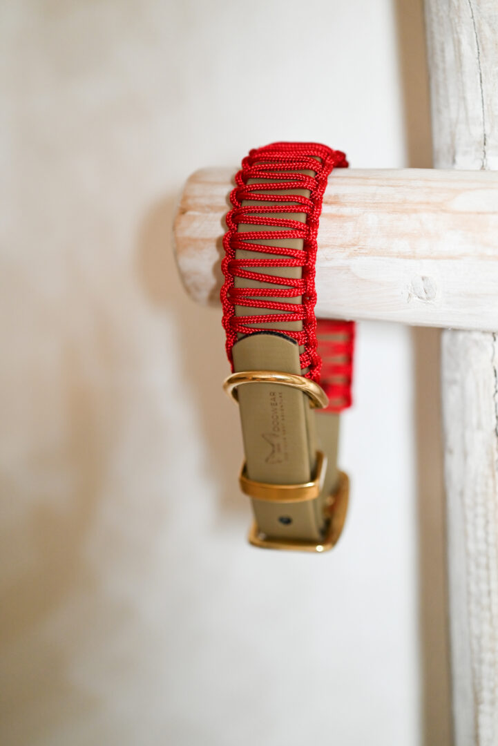 Robustes 20 mm oder 25 mm breites BioThane®-Material in Sand handumwebet mit Paracord für Langlebigkeit und Wetterbeständigkeit.