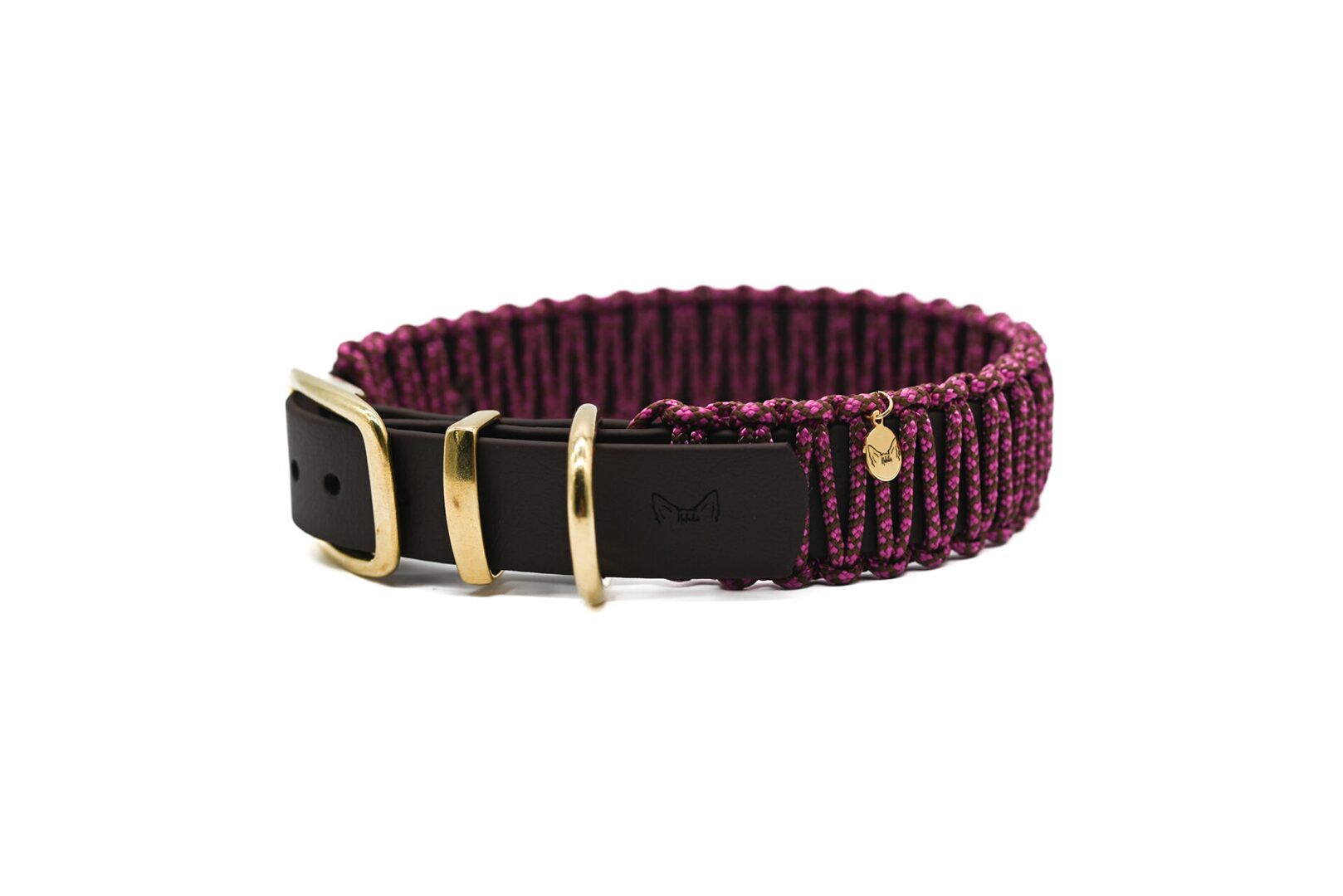 Dunkelbraunes BioThane®-Material – Stilvoll umwebt mit Paracord Typ II und Accessoires deiner Wahl für einen eleganten Look. Praktischer Ring für die einfache Befestigung von Leine und Hundemarken.