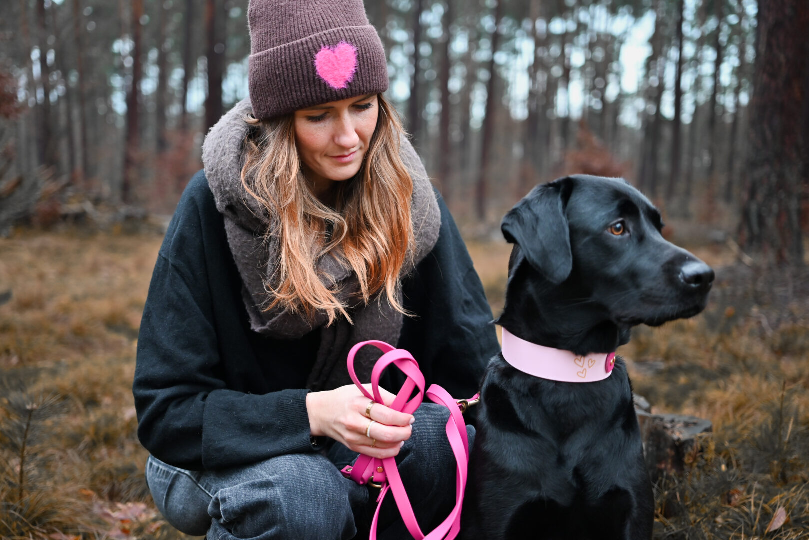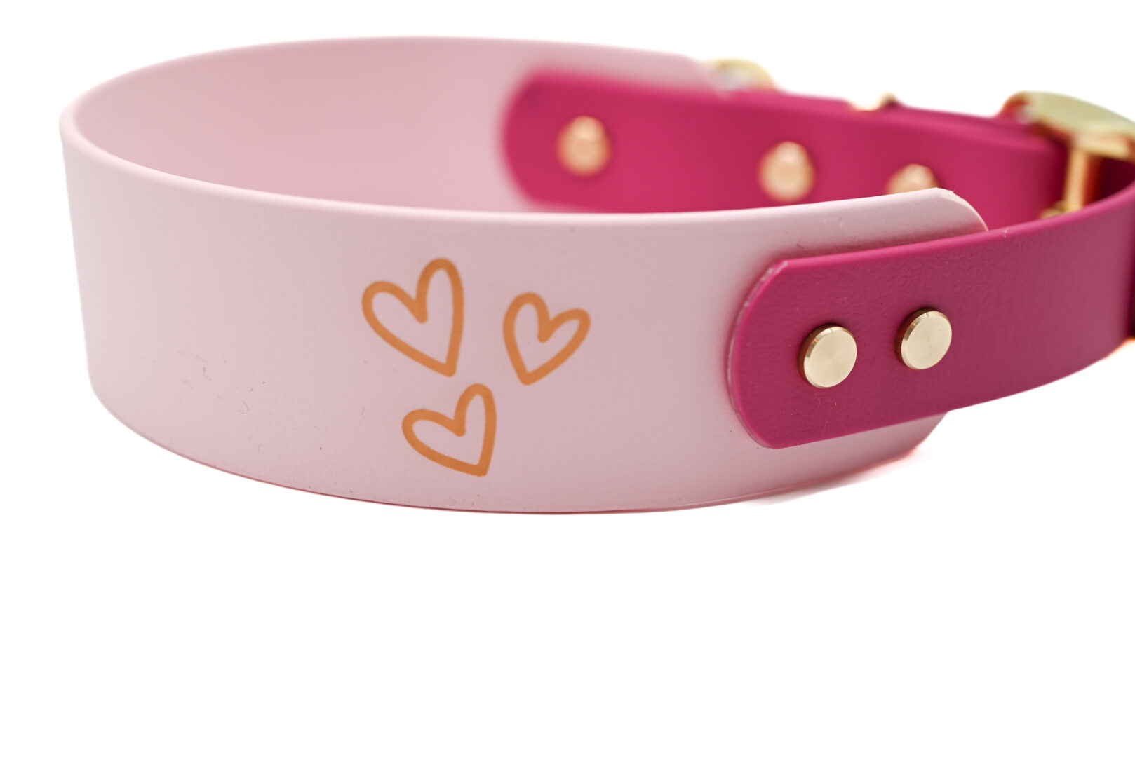 Robustes 25 mm und 38 mm breites BioThane®-Material in Magenta Rosa und Rosa für Langlebigkeit und Wetterbeständigkeit. Mit süßer Herzgravur <3