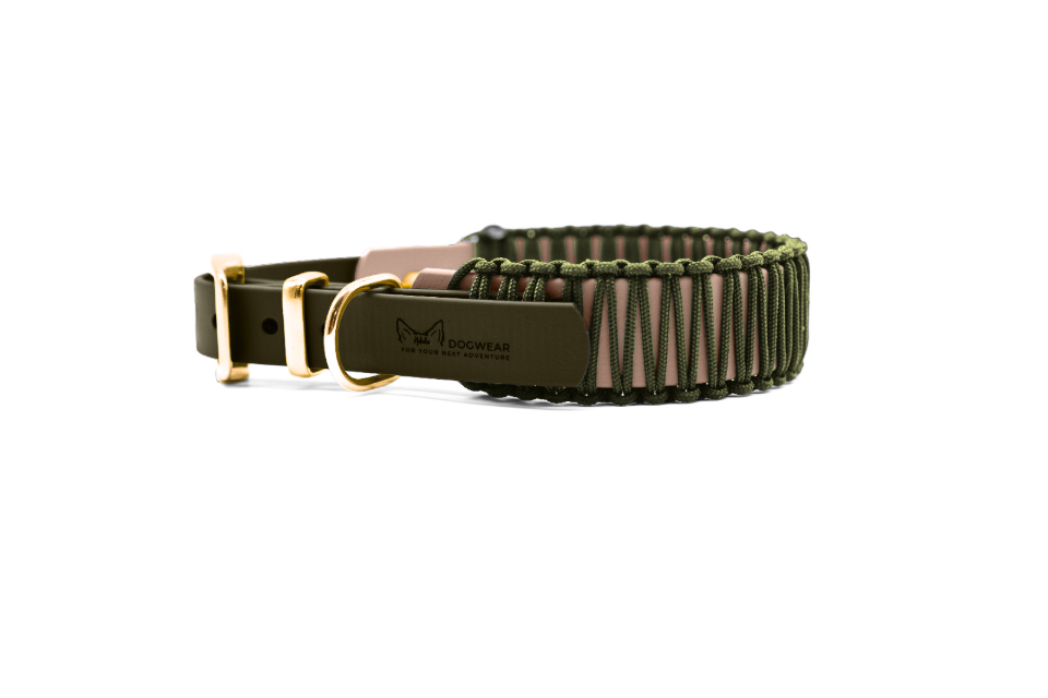 Robustes 20 mm und 25 mm breites BioThane®-Material in Rosa und Khaki handumwebet mit Paracord für Langlebigkeit und Wetterbeständigkeit.