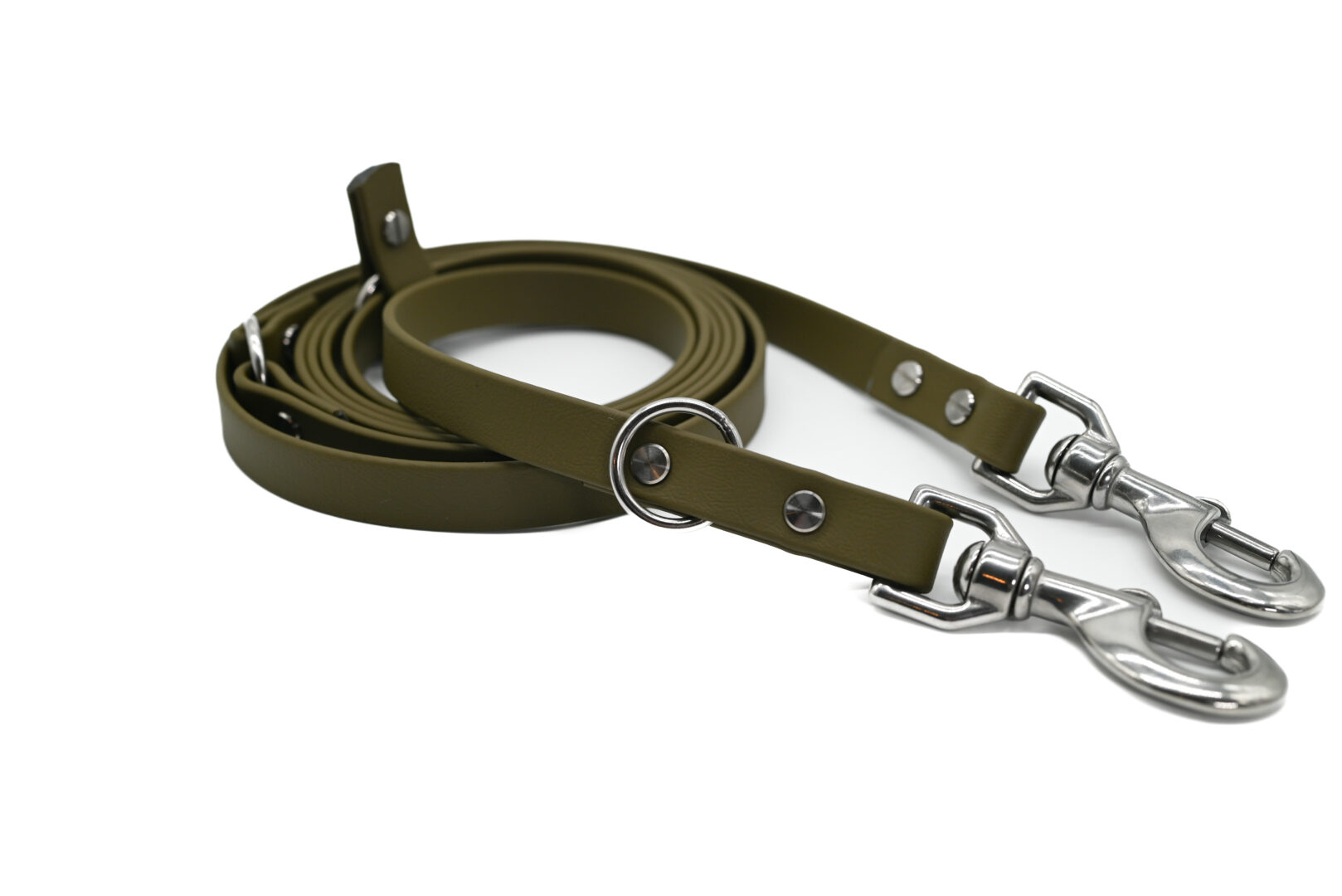 Die Leine besteht aus BETA-BioThane®, welche eine lederähnliche Optik und eine entsprechend strukturierte Oberfläche hat. BioThane® ist haltbarer und langlebiger als Leder, ist absolut wasserdicht, schmutzabweisend und fühlt sich großartig an.